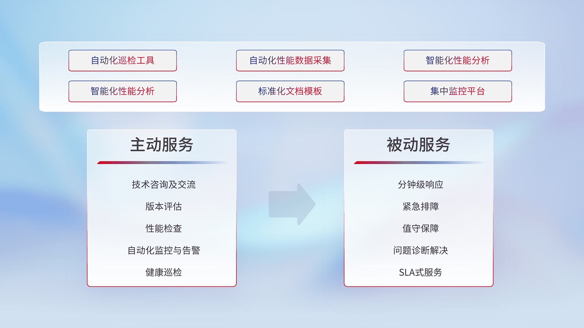 智能化工具和标准化文档,,,,保障服务质量,,,,提供主动服务(包含技术咨询、、版本评估、、性能检查、、、、自动化监控与告警、、、健康巡检)和被动服务包含(分钟级响应、、紧急排障、、、值守保障、、、、问题诊断解决、、SLA服务)。。